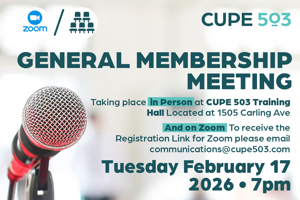 On Tuesday, February 17th at 7pm we are hosting our Hybrid General Membership Meeting. CUPE 503 Members will be able to join In Person at 1505 Carling Ave and on Zoom.