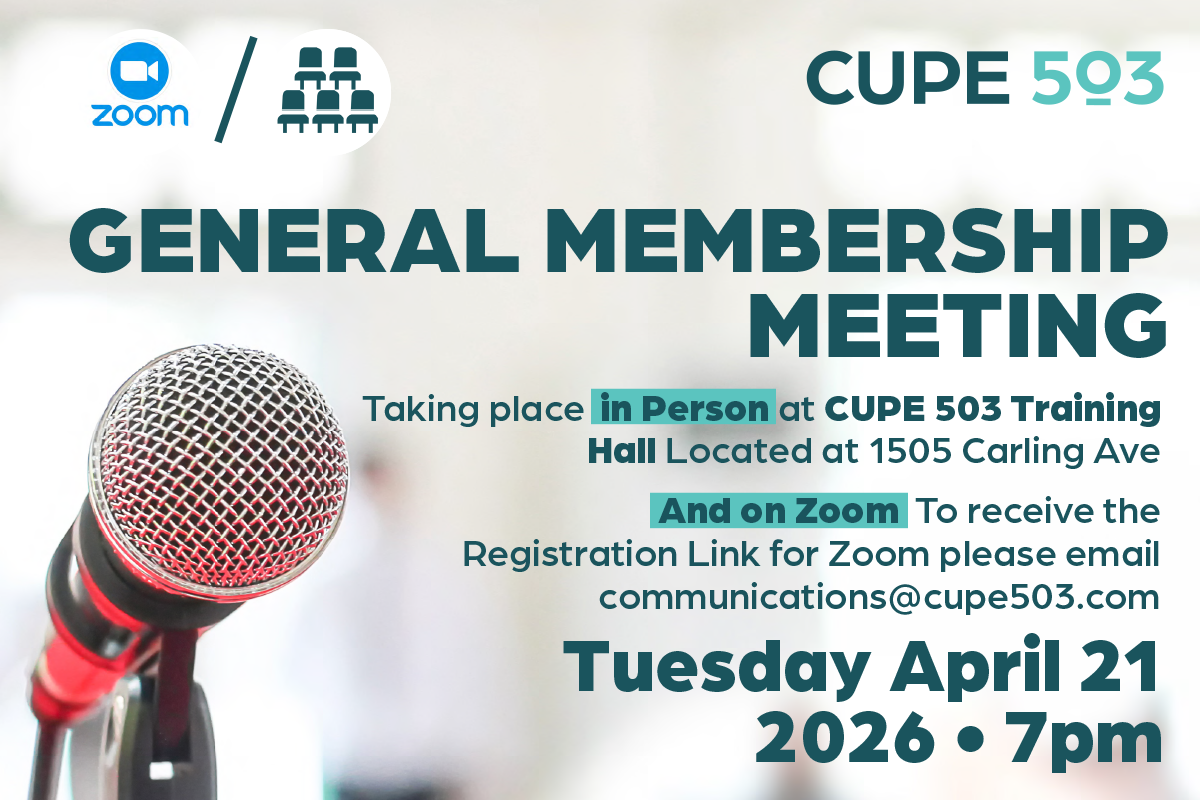 On Tuesday, April 21st at 7pm we are hosting our Hybrid General Membership Meeting. CUPE 503 Members will be able to join In Person at 1505 Carling Ave and on Zoom.